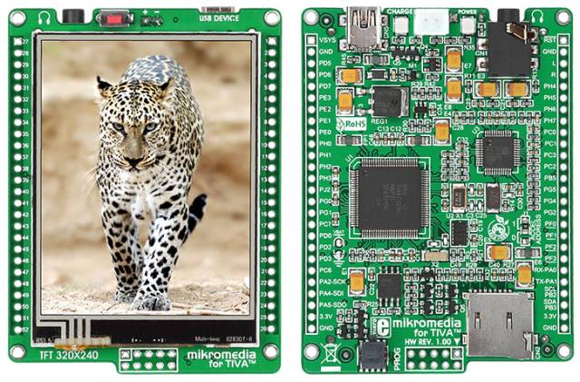 Compact multimedia development platform for TI's Tiva C Series TM4C123GH6PZ ARM Cortex-M4 microcontroller.