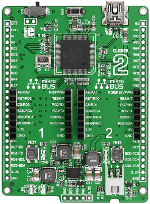 clicker 2 for PIC18FJ is a compact dev. kit with two mikroBUS sockets for click board connectivity. You can use it to quickly build your own gadgets with unique functionalities and features. It carries an 8-bit PIC18F87J50 device, preloaded with a fast USB-HID bootloader (no programmer necessary). The board also features a li-po battery connector and LTS3586-2 power management IC. Additional features include 2x26 connection pads on the sides of the board, and some buttons, switches and LEDs. |
