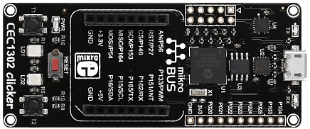 CEC1302 clicker CEC1302 clicker is an amazingly compact starter development kit which brings click board connectivity to the 32-bit ARM Cortex-M4 CEC1302 microcontroller with an integrated cryptographic engine. Connect the desired click board to enhance it with awesome features. It's preprogrammed with a fast USB HID bootloader. Use it to upload your firmware and clicker will become a working device. Board features all you need to get started: 32-bit CEC1302 microcontroller, USB connector, two LEDs and push buttons, reset button, mikroProg connector and headers for interfacing with external electronics.