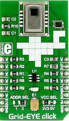 Grid-EYE click is a 8x8 thermal array sensor-detector that carries the AMG8853 infrared array sensor from Panasonic. The click is designed to run on either 3.3V or 5V power supply. It communicates with the target MCU over I2C interface.